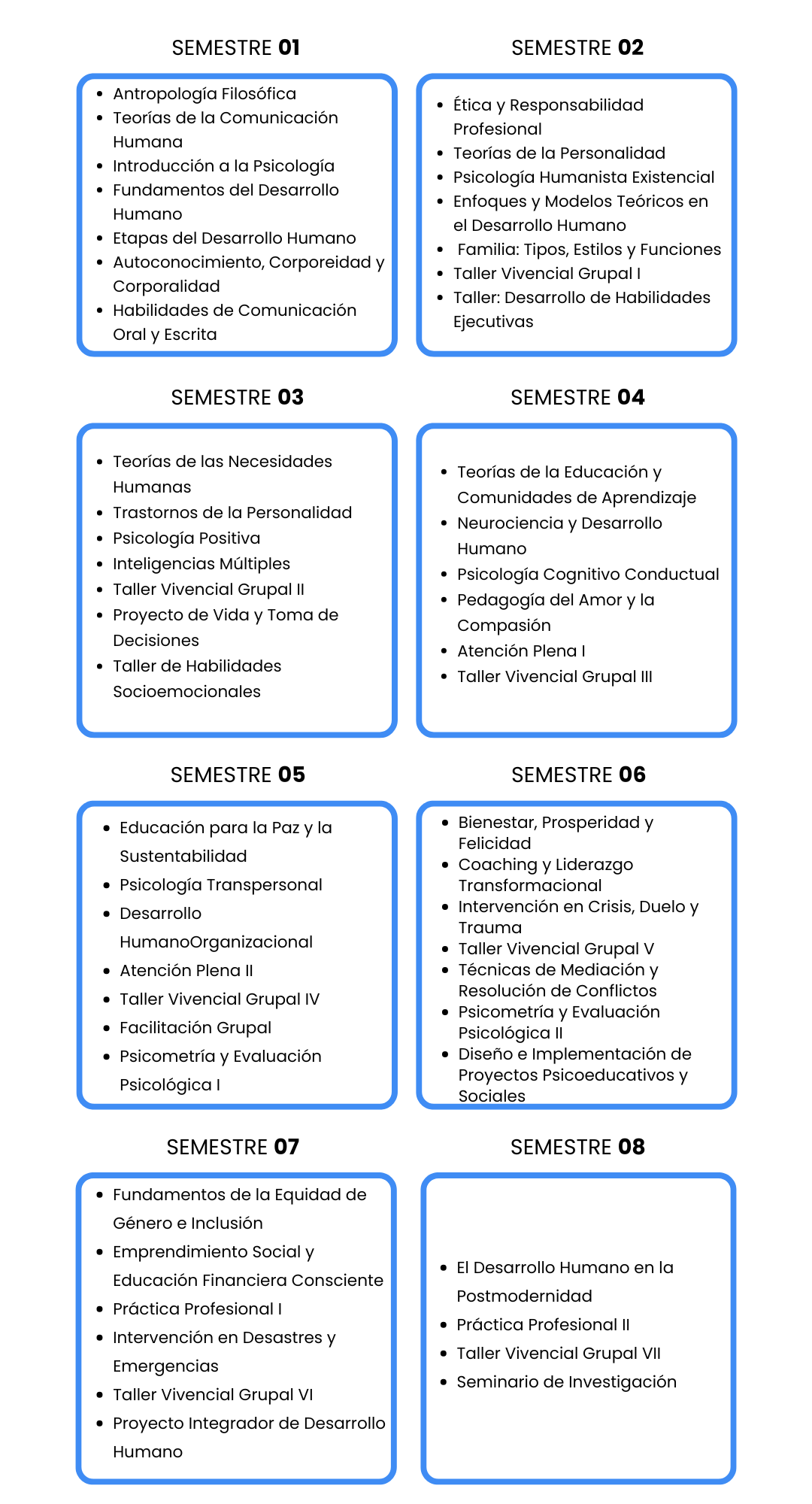 Es una licenciatura que pone al ser humano en el centro. Estudiar Desarrollo Humano es aprender a acompañar a las personas, grupos y comunidades en su crecimiento personal, emocional y social. Aquí formarás las herramientas teórico prácticas necesarias para promover el bienestar, el autoconocimiento, la empatía, la comunicación efectiva y el desarrollo de habilidades para la vida, el Desarrollo Humano promueve la dignidad, la conciencia, el sentido de vida y la mejora continua del ser humano en todos sus contextos.